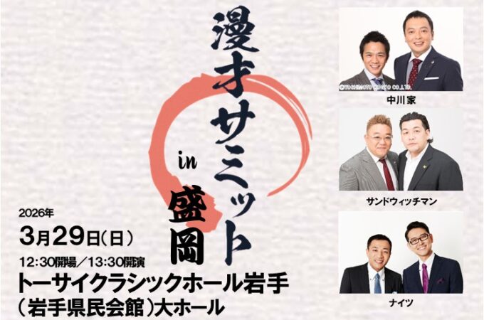 2025.12.25NEWSLIVE/EVENT3/29(日)「漫才サミット in 盛岡」開催決定!「サンドウィッチマン倶楽部」プレミアム会員限定抽選予約受付!